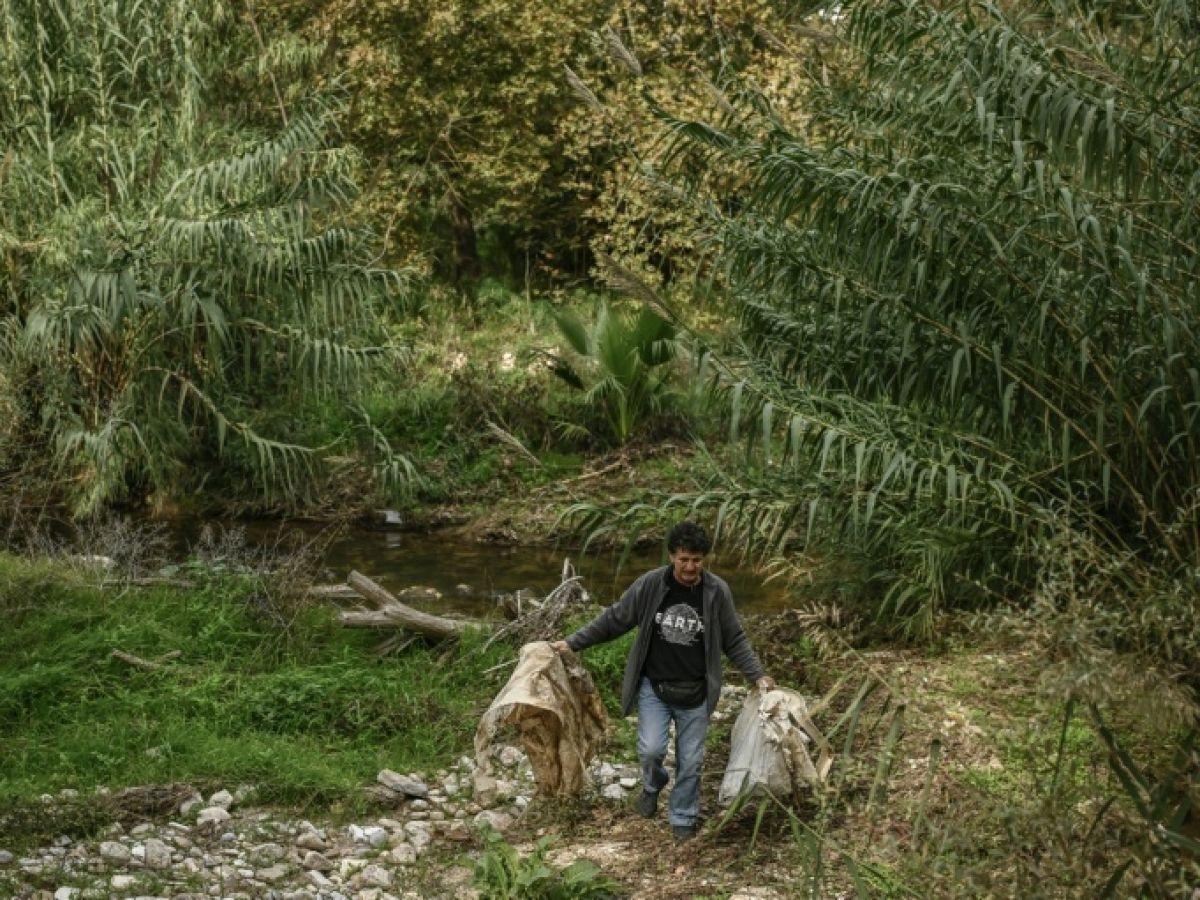Entre les roseaux et les platanes centenaires qui longent la rivière Kifissos dans l’ouest d’Athènes, Tassos Sikoutris ramasse bouteilles plastiques et déchets rouillés qui jonchent « ce dernier tronçon naturel » menacé par des travaux de prévention des inondations.