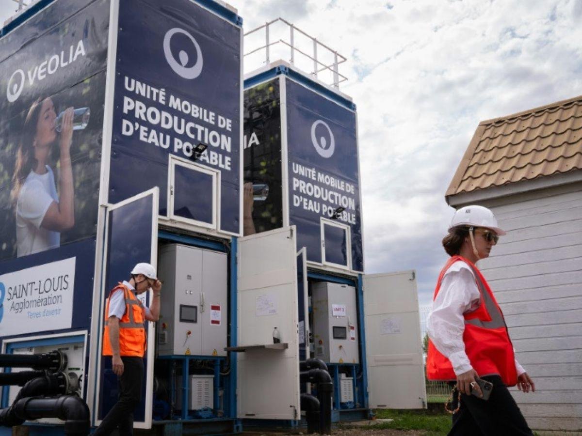 Installées par Veolia, les citernes de cette « unité mobile de traitement » sont remplies de charbon actif, une matière qui absorbe les substances per- et polyfluoroalkylées (PFAS), dits « polluants éternels » car extrêmement difficiles à éliminer une fois dans l’eau ou les sols.