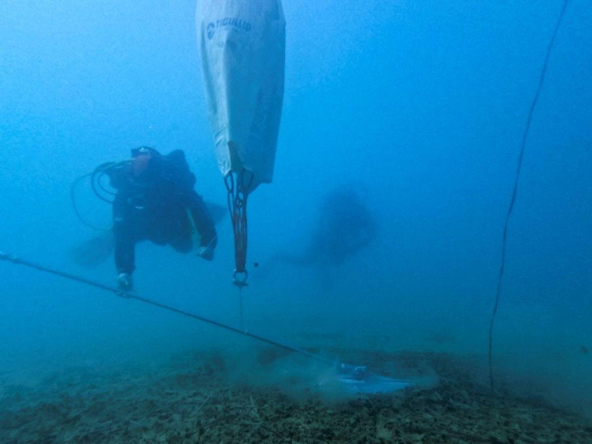 A l’aide d’une perceuse spéciale, ce plongeur professionnel creuse à au moins trois mètres de profondeur dans le fond marin avant de planter l’ancre à deux ailettes symétriques.
