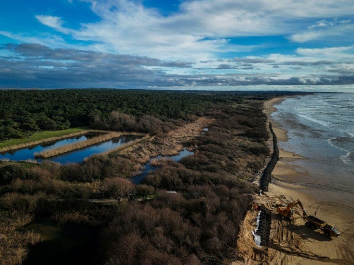 Sur une plage de l’île d’Oléron, un engin entasse de gros filets de pierres contre un cordon dunaire. Des travaux sont réalisés en urgence face à l’érosion littorale, qui menace la lagune d’infiltration des eaux traitées par une station d’épuration voisine.